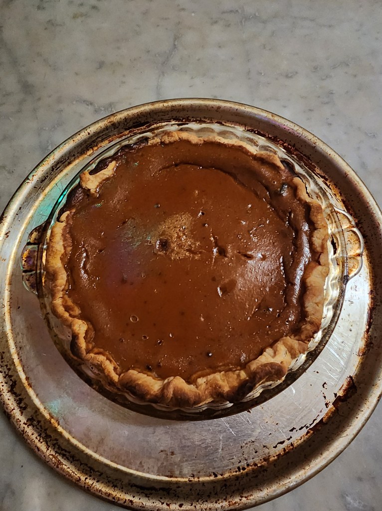 Until I am able to take care of this issue, a couple of workarounds:1. I will type faster, and 2. write less. the posts will be shorter. So, what do I want to say? Yes, thanksgiving was wonderful, but last week, a revelation. I had not made a pumpkin pie at all this year, I mean just straight pumpkin pie, so I decided to make one last Friday for a little Christmas Tree shin-dig. I’d forgotten that one of our favorite shops in town, The Sword and Rose, was celebrating an anniversary and we went to pick up some things and celebrate. It’s a metaphysical shop, specializing in tarot cards and readings, house blended incense, candles, bath salts, you know that kinda thing. The point is, the pie hadn’t finished baking by the time we needed to get out there to the shop and meet friends.