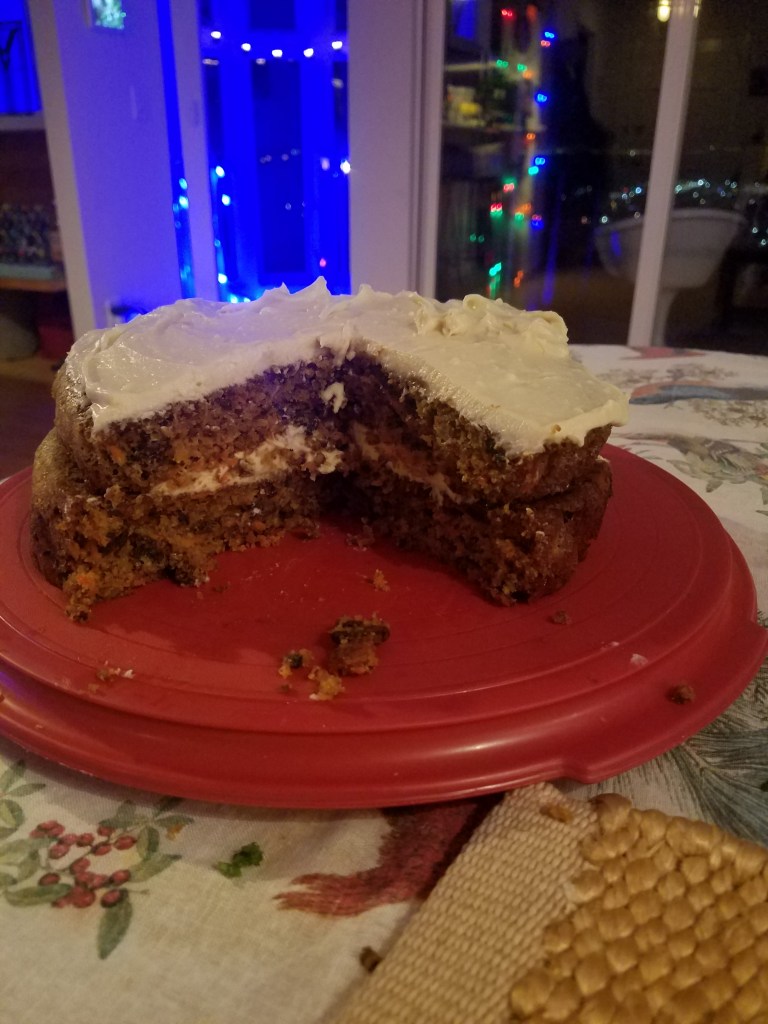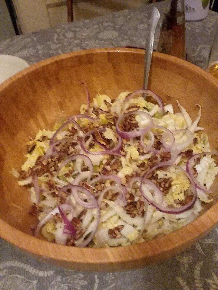 The Christmas menu was a bust in that I didn´t make it at once. The upside is that we enjoyed it over several days. Christmas Day was Shepherd´s Pie, a slam dunk in the comfort food department. The chocolate orange marmalade cake came next. Touchdown. The Three Kings salad was a surprise delight. Napa Cabbage with Lychee fruit and kiwi fruit, toasted nuts, vinaigrette. Home run. The salad was the perfect companion to the surprise Kung Pao Shrimp I stir fried.