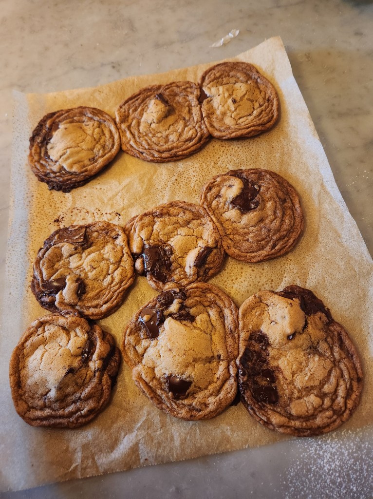 But spread they did. And they are absolutely delicious. This is a great one-bowl chocolate chip cookie when you need cookies impulsively. A lot of what slows cookies down is letting the butter come to room temperature, then creaming with the sugar. This recipe has us whisk the sugars together with melted butter. That, plus only one egg and a little baking soda, and bang!! you got yourself a flat, spread, super chewy cookie in your mouth. I used whole chocolate bars from Ghirardelli, dark chocolate, 80 something cacao. It’s a good cookie.