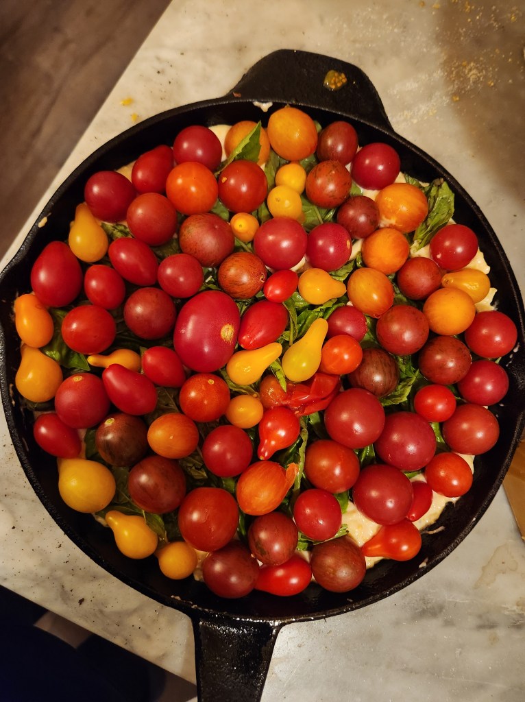 It started with a full to bursting flat of cherry tomatoes, all shapes, sizes and colors, from ruby red to deep purple to pale green. They were gonna rot right there in front of me if I didn’t act fast. Just like that Poirot!