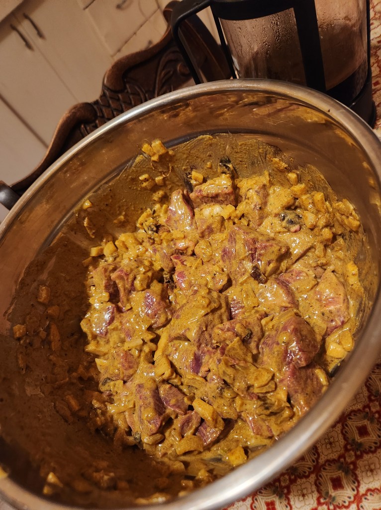 What moves in the mind of a man while he sleeps? I woke with a shudder at 5:17 AM. I had but one objective, one reason for being: to cut the leg of lamb into manageable cubes and marinate it. Yes, I had a full day of actual, out in the world, making the Benjamins, work ahead of me, and if I’m gonna throw down some kebabs for suppa, my guests deserve well-marinated ones. As I explained in the last cliff-hanger, Ms. Duckitt transcribed the recipe for this dish, and the marinade, a South African creation, is key to its success. Tamarind paste is wonderful, subtly sour and fruity, plus curry powder. I used a Japanese curry powder that balanced in sweetness the sour of the tamarind. Lemon zest, salt, onion, and milk. Yes, milk. Lactic acid helps tenderize the meat. Buttermilk fried-chicken is familiar, no?