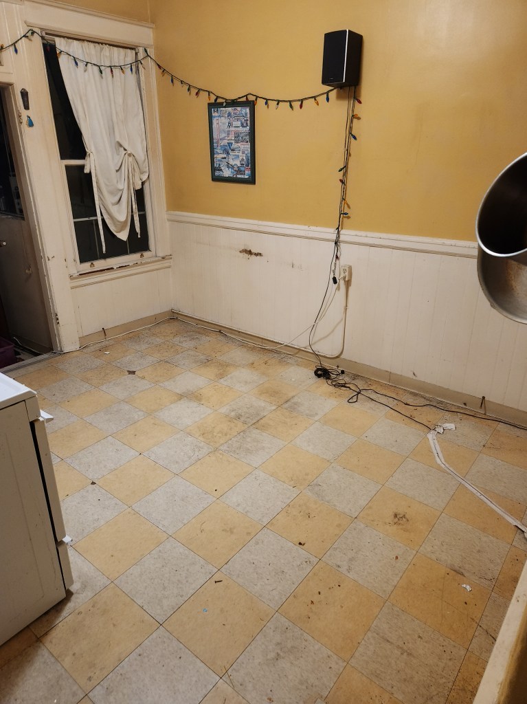 Before. Yes, the floor is filthy. It’s impossible to clean because the harder you scrub, the easier the tiles pop up from the floor. Bye bye, old floor.