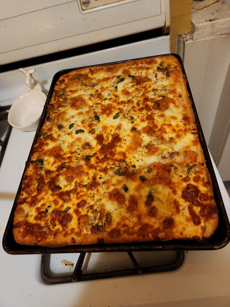 You can make thin, free form crusts right on the baking stone. You can make it in normal round pans for a typical, thinnish crust pan pizza. Or, you can do what I did, enough dough for two pizzas into one large baking tray. What is it about square pieces of pizza that I love so much more than triangles? Actually, triangles are OK if they are thin and you can fold them a la New York style. This slightly thicker crust is sturdy and so so good, adorned with the supreme pair of pizza toppings. Now I’m not taking about pepperoni and sausage, it’s definitely not pineapple and ham, and it is most certainly absolutely not chicken and barbeque sauce. It is green pepper and mushrooms. I’ve been thinking lately that green bell pepper may be my favorite vegetable. I love them cooked in all forms stuffed, diced, stir-fried, boiled, roasted. Back to our pizza, suffocating beneath an avalanche of mozzarella and mozzarella bufala. Fresh basil. Salt and pepper. Simply delicious. Here’s the picture again: