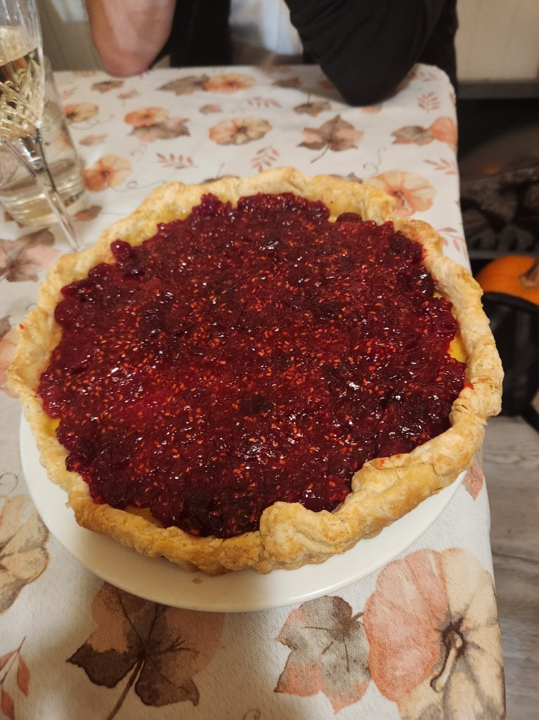 A welcome and refreshing change from pumpkin pie, though we all love that too, don’t we? A wonderful, light vanilla custard topped with pureed raspberries and cranberries. Tangy and only lightly sweet. Not cloying or heavy at all. Just perfect.
