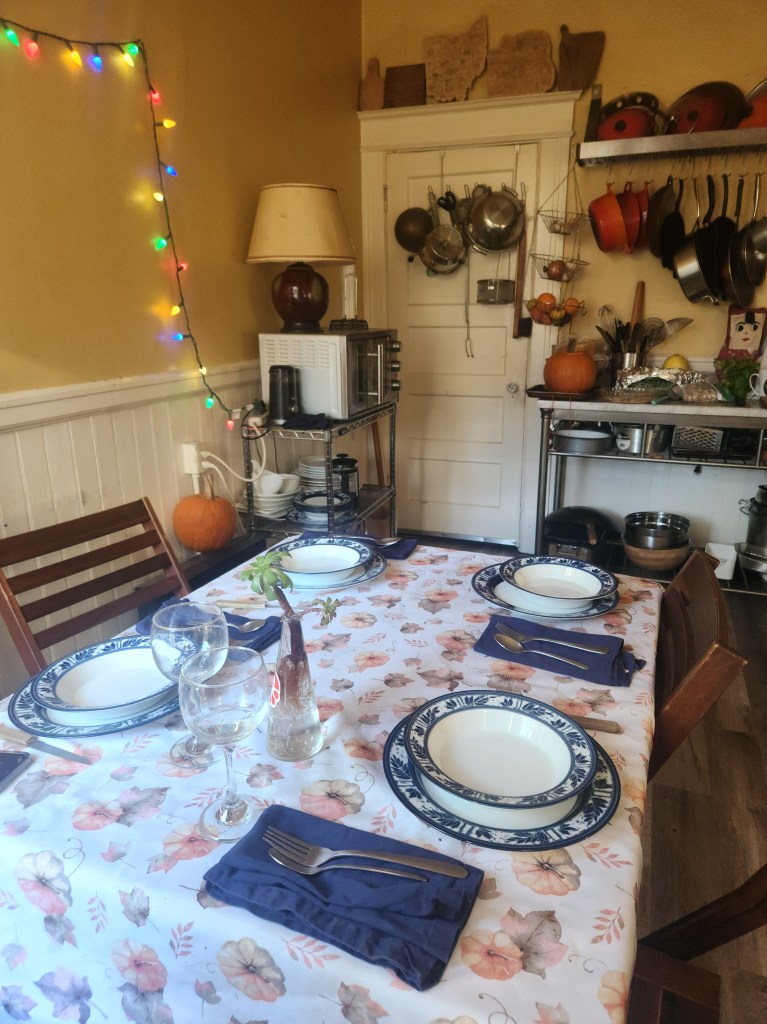 But here’s the exciting part. A kitchen full of treasures. I’ve decided to do a few different things this year. We’re gonna start with pumpkin. Pumpkin soup, served in the pumpkin. I have a rich and wonderful chicken/vegetable broth that will go beautifully in the pumpkin, a nice, light starter. Then, for dessert, I am going to do a Cranberry and Raspberry tart. To get our pumpkin spice fix, sweet potato casserole. Then the usual, turkeystuffinggravymashedpotatoescranberrysauce. It really is just one dish.