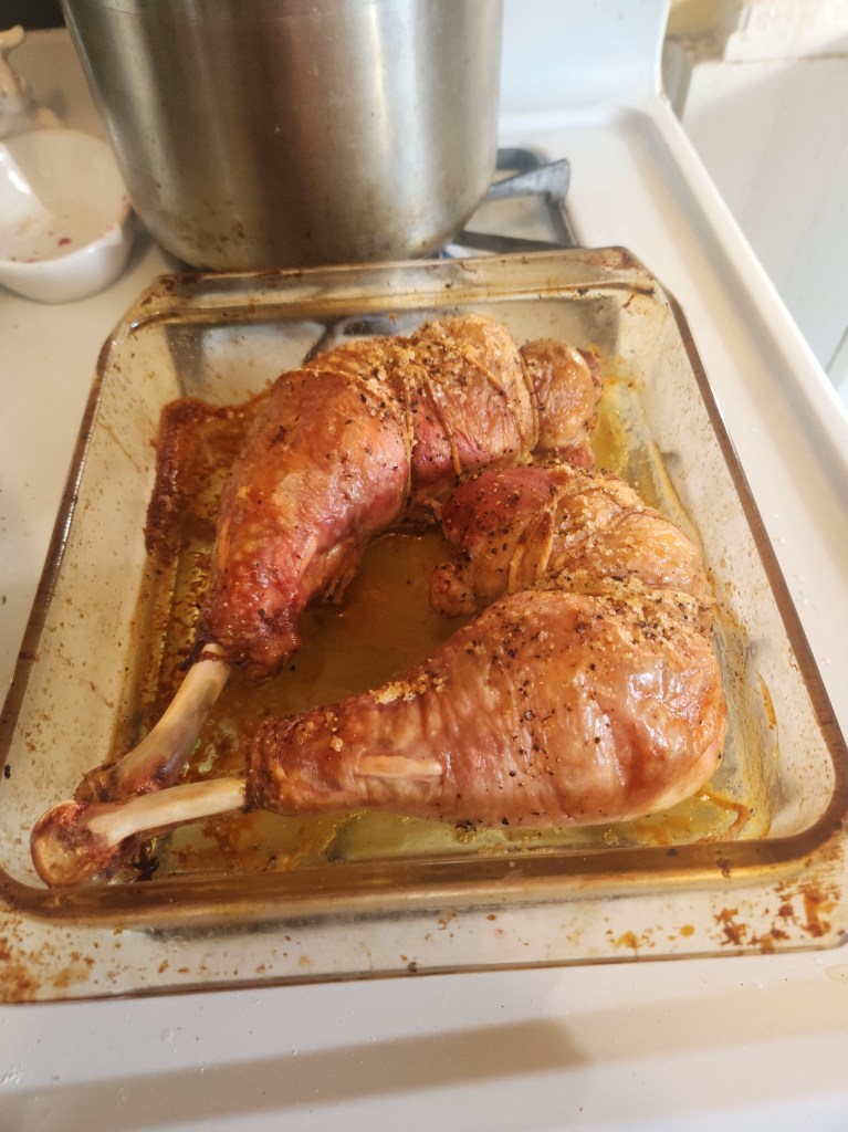 That Julia Child. I cursed her name a few times while prepping this poor animal, but in the end, I and the art of fine cooking prevailed, and we all agreed that this is the best way to prepare turkey legs. Remove the thigh bone, roll up the meat, wrap the skin around the exposed meat, then truss it all up, and bang you got yourself the miracle pictured above. I should mention that before suture took place I seasoned the now boneless meat with salt, pepper, and a few fresh sage leaves. It was absolutely wonderful. This is not just meat for Thanksgiving, it is a special occasion of all sorts sort of thing. I may make it again for my birthday or something fine like that.
