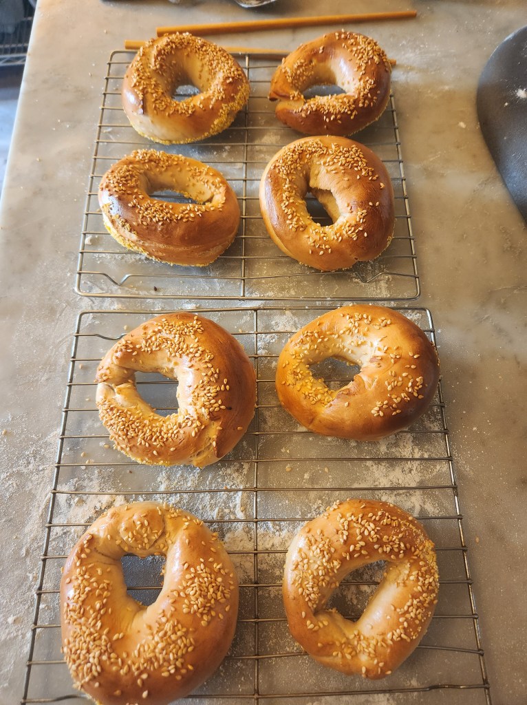In addition to the death going around, atmospheric rivers. The atmospheric river Styx, if you will. Rain, rain, pouring down. What then to do but bake? Or, in the case of bagels, boiled then baked. Certainly wonderful, a great texture. Dense and chewy inside, light and crisp on the outside. And so easy, too easy. I would dare say the best bagel I’ve had on the West Coast. When it wasn’t raining, it was this: